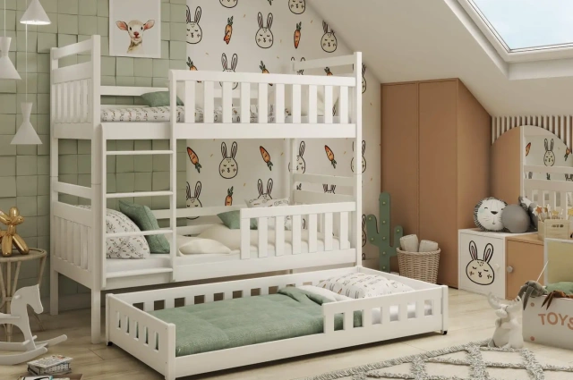 Das Etagenbett OLIWIA ist ein hervorragender Vorschlag für all diejenigen, die den freien Platz in ihren Zimmern auf bestmögliche Art und Weise nutzen möchten. Dank dem ausziehbaren 3.Bett haben Sie einen zusätzlichen Schlafplatz immer dann, wenn Sie ihn brauchen. Wir versichern, dass Ihre Kinder mit dem Bett sehr zufrieden werden und bald gar nicht mehr woanders schlafen wollen. Das Bett wurde auf Sicherheit getestet und erfüllt die Normen im Bereich der sicheren Nutzung. Das Bett mit der dreifach beschichteten Oberfläche, lackiert mit den ökologischen Farben im Sprühverfahren, gemäß den Anforderungen der Norm EN 71-3:2013. Demnach sind alle Lacke für den Anstrich von Kindermöbeln qualifiziert und verfügen über entsprechende Zulassungen. Einzelelemente wurden nicht aus verleimten Holzbrettern sondern aus Massivholz-Kiefernholzbrettern angefertigt. Das Etagenbett kann in zwei Einzelbetten geteilt werden.