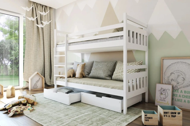 Das Etagenbett mit einer einzigartigen Optik, ermöglicht dem Kind - sowohl einem Mädchen als auch einem Jungen - eine schnelle Gewöhnung ans Alleinschlafen. Wir versichern, dass Ihre Kinder mit dem Bett sehr zufrieden werden und bald gar nicht mehr woanders schlafen wollen. Das Bett wurde auf Sicherheit getestet und erfüllt die Normen im Bereich der sicheren Nutzung. Das Bett mit der dreifach beschichteten Oberfläche, lackiert mit den ökologischen Farben im Sprühverfahren, gemäß den Anforderungen der Norm EN 71-3:2013. Demnach sind alle Lacke für den Anstrich von Kindermöbeln qualifiziert und verfügen über entsprechende Zulassungen. Einzelelemente wurden nicht aus verleimten Holzbrettern sondern aus Kiefernholzbrettern angefertigt. Das Etagenbett kann in zwei Einzelbetten geteilt werden. Bei weißen Bettkästen bestehen die Fronten und die Seiten aus Spannplatten von hoher Qualität, bei Bettkästen in der Farbe: Kiefer bestehen die Fronten aus Spannplatten von hoher Qualität. Die Bettkästen in allen anderen Farben werden aus Kiefernholz hergestellt. Beachten Sie bitte, dass das im Bild dargestellte Produkt vom verkauften Produkt geringfügig abweichen kann. Die Schubladen haben Schraubenabdeckungen die auf dem Bild nicht zu erkennen sind.