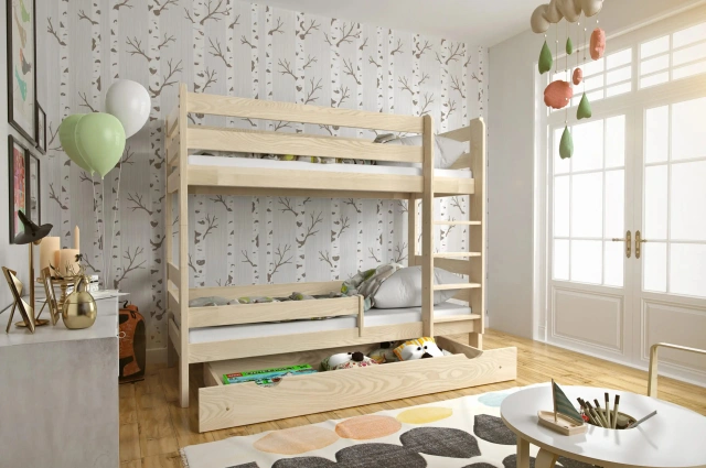 Das Bett GAT ist aus Kiefernholz von höchster Qualität hergestellt. Alle Elemente sind sorgfältig und sicher hergestellt, mit abgerundeten Kanten. Das Kinderbett ist vielseitig, weshalb sowohl die Geländer als auch die Schublade von beiden Seiten angebracht werden können. In der Standardausführung wird das kurze Schutzgeländer an einer der Kopfstützen befestigt und kann später abgenommen werden. Das Etagenbett kann in zwei Einzelbetten geteilt werden. Das Bett ist gebeizt und 3 Mal mit kindersicheren Lacken beschichtet. Das Bett wurde auf Sicherheit getestet und erfüllt die Normen im Bereich der sicheren Nutzung. Die Möbel aus Holz sind langlebig, angenehm in Berührung und zeichnen sich durch robuste Konstruktion und Stabilität aus, so dass ihre Anwendung bequem und unkompliziert ist.