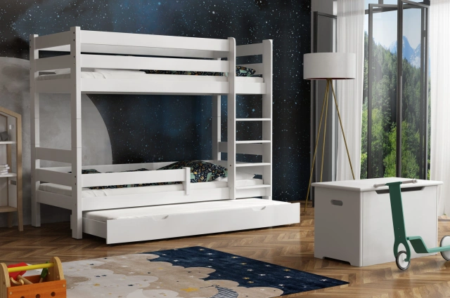 Das Bett GAT TRIO ist aus Kiefernholz von höchster Qualität hergestellt. Alle Elemente sind sorgfältig und sicher hergestellt, mit abgerundeten Kanten. Das Kinderbett ist vielseitig, weshalb sowohl die Geländer als auch die Schublade von beiden Seiten angebracht werden können. Das Etagenbett kann in zwei Einzelbetten geteilt werden. In der Standardausführung wird das kurze Schutzgeländer an einer der Kopfstützen befestigt und kann später abgenommen werden. Das Bett ist gebeizt und drei Mal mit kindersicheren Lacken beschichtet. Das Bett wurde auf Sicherheit getestet und erfüllt die Normen im Bereich der sicheren Nutzung. Die Möbel aus Holz sind langlebig, angenehm in Berührung und zeichnen sich durch robuste Konstruktion und Stabilität aus, so dass ihre Anwendung bequem und unkompliziert ist.