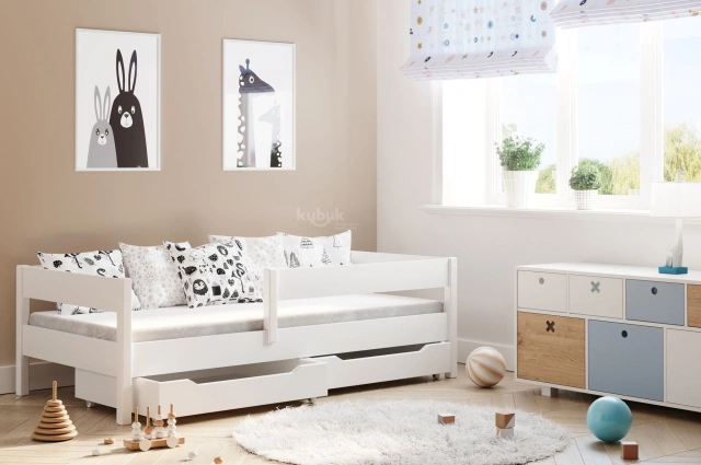 Schönes Bett MIX mit zwei Schubladen ist sehr stabil und funktional. Das Bett ist aus robustem Kiefernholz (Konstruktion und Beine) angefertigt nur Rahmenbetten und Rausfallschutz sind aus Spanplatten - höchster Qualität. Sehr stabile, robuste Konstruktion. Das Bett ist ideal für Kinder und hat solide Stellageunter der Matratze. • Zwei Schubfächer angepasst an die Bettlänge • Stilvolle Ausschnitte ersetzen Griffe • Die Breite der Schubfächer ist an die Bettgröße angepasst • Der Boden aus Sperrholzplatte, mit Schaftschrauben befestigt • Gummierte Räder Beachten Sie bitte, dass das im Bild dargestellte Produkt vom verkauften Produkt geringfügig abweichen kann.