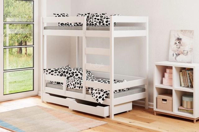 Zwei-Personen-Bett. Zwischen den Betten kann man frei sitzen. Die funktionelle Konstruktion erspart den Raum. Die Gitter stellen den Rausfallschutz dar. Rahmen aus erstklassigem Massivholz, 25 mm stark: •    Zwei Schubfächer angepasst an die Bettlänge •    Stilvolle Ausschnitte ersetzen Griffe •    Die Breite der Schubfächer ist an die Bettgröße angepasst •    Der Boden aus Sperrholzplatte, mit Schaftschrauben befestigt •    Gummierte Räder Bett geeignet für 10 - 12 cm dicke Matratzen