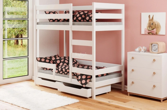 Zwei-Personen-Bett. Zwischen den Betten kann man frei sitzen. Die funktionelle Konstruktion erspart den Raum. Die Gitter stellen den Rausfallschutz dar. Rahmen aus erstklassigem Massivholz, 25 mm stark: • Zwei Schubfächer angepasst an die Bettlänge • Stilvolle Ausschnitte ersetzen Griffe • Die Breite der Schubfächer ist an die Bettgröße angepasst • Der Boden aus Sperrholzplatte, mit Schaftschrauben befestigt • Gummierte Räder Bett geeignet für 10 - 12 cm dicke Matratzen